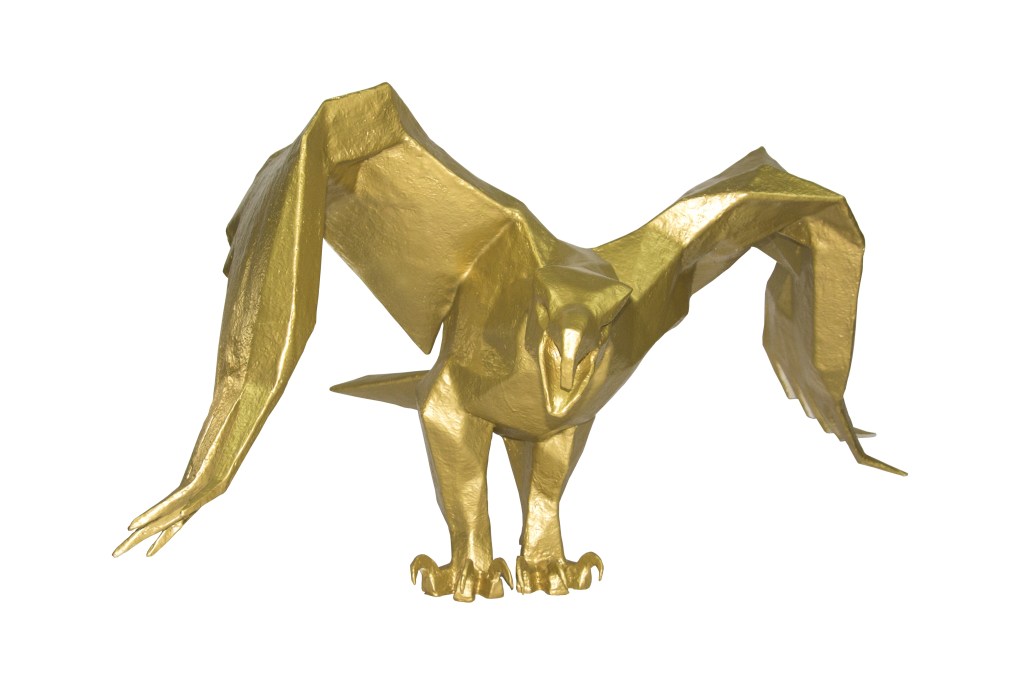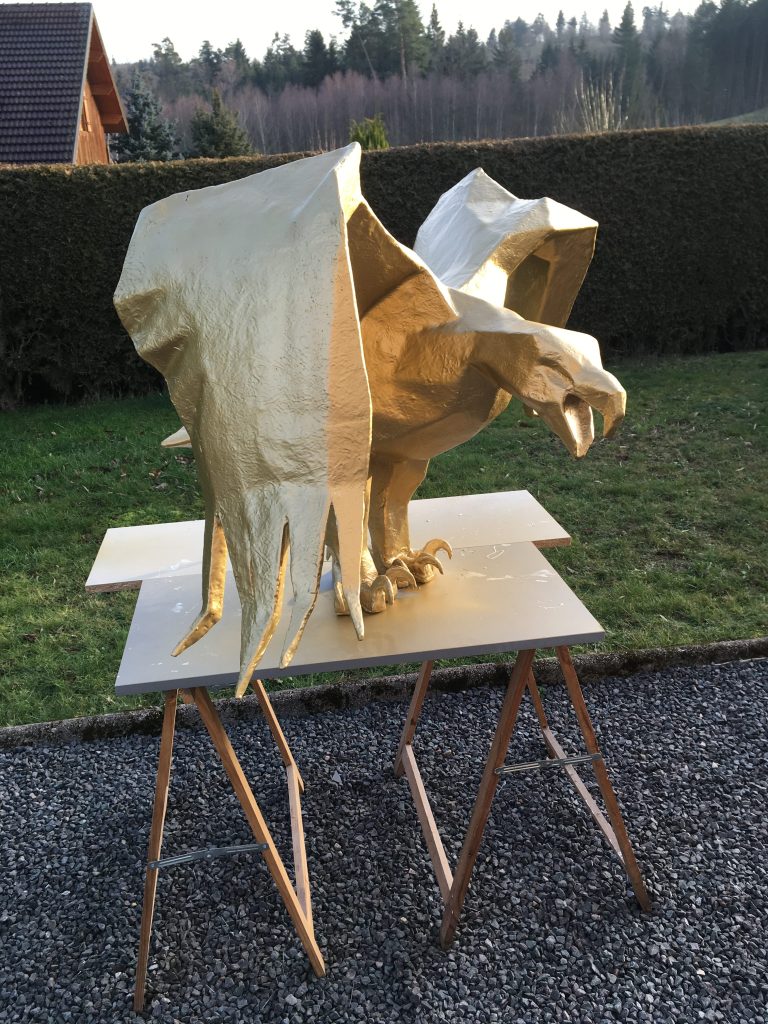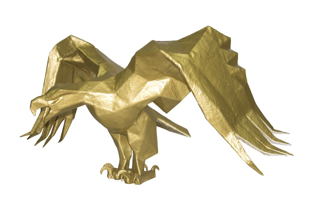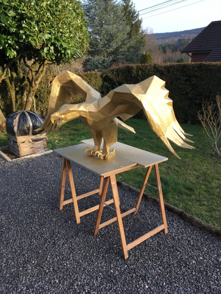 L’Aigle ; 2016; restauration 2020 ; Carton gris 2,5mm, résine polyester, mat de verre, peinture aérosole or Montana ; Vernis aérosol mat.