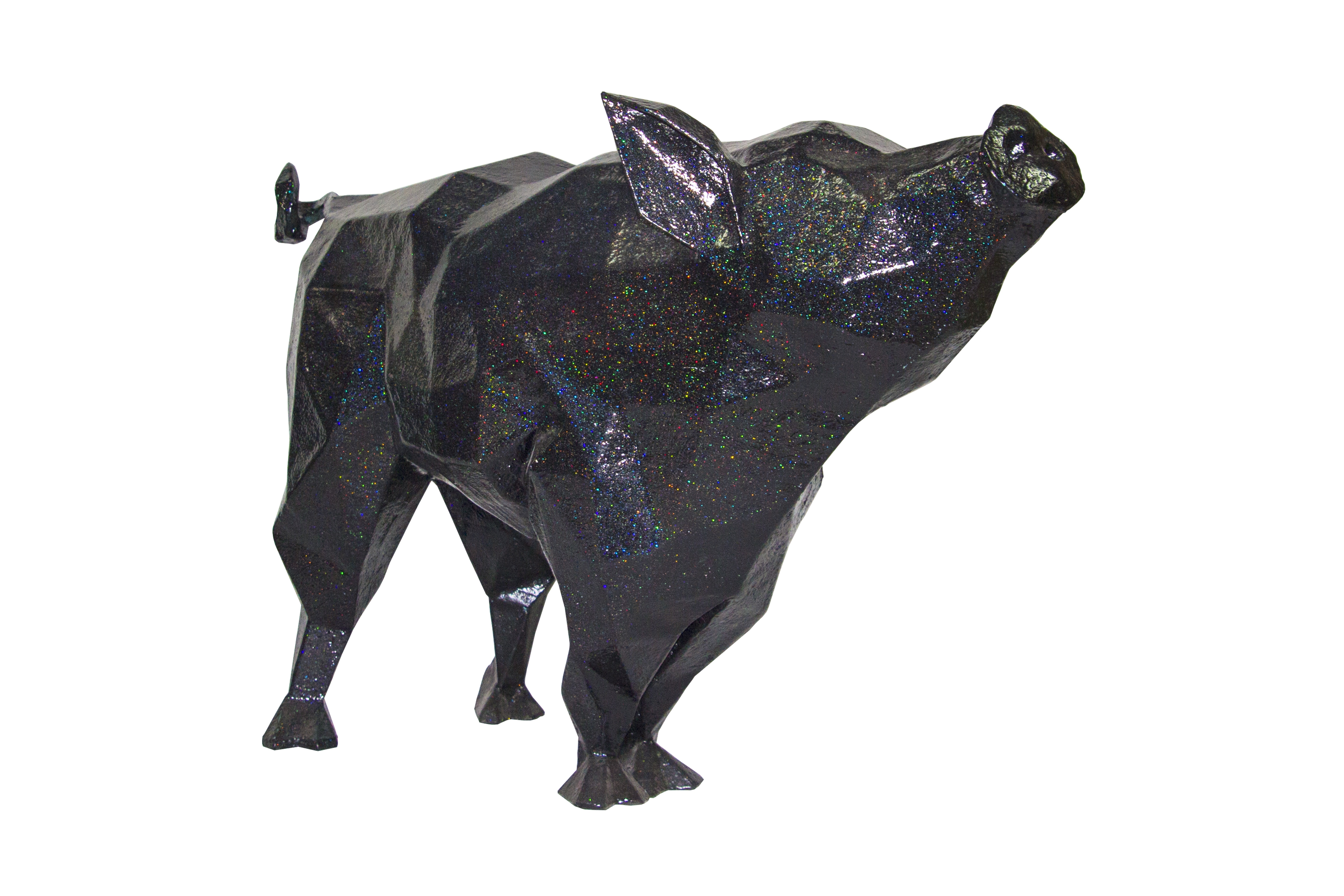 Le Cochon ; 2015; Restauration 2018 ; Carton gris 2,5mm, résine polyester, mat de verre, peinture aérosole noir, vernis Montana hologramme ; 70x100x50 cm ; Anould ; France.