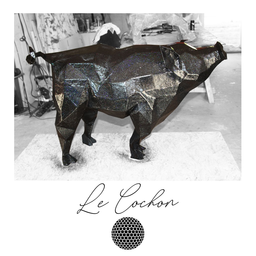 Le Cochon ; 2018 ; Carton gris 2,5mm, résine polyester, mat de verre, peinture aérosole noir, vernis Montana hologramme ; 70x100x50 cm ; Anould ; France.