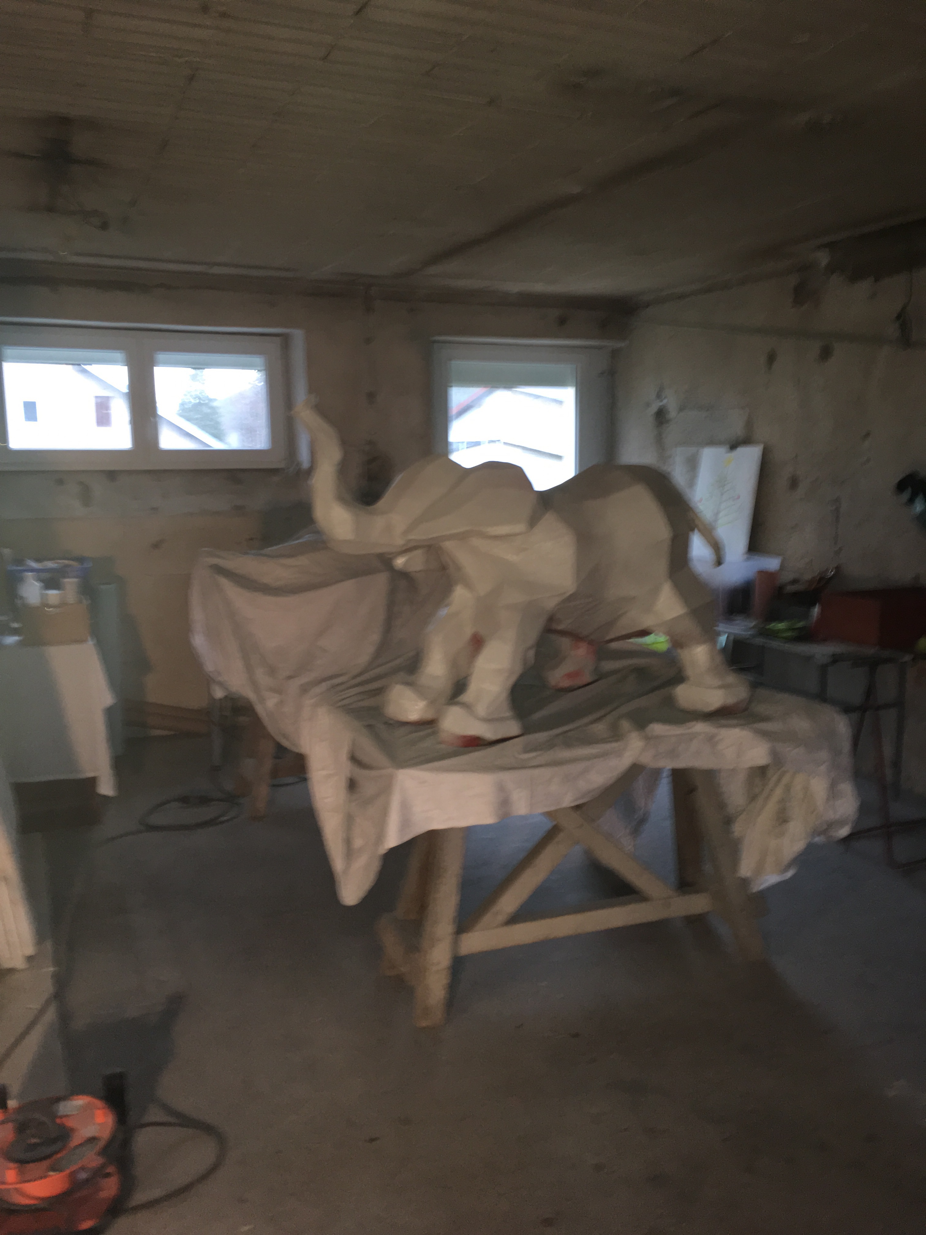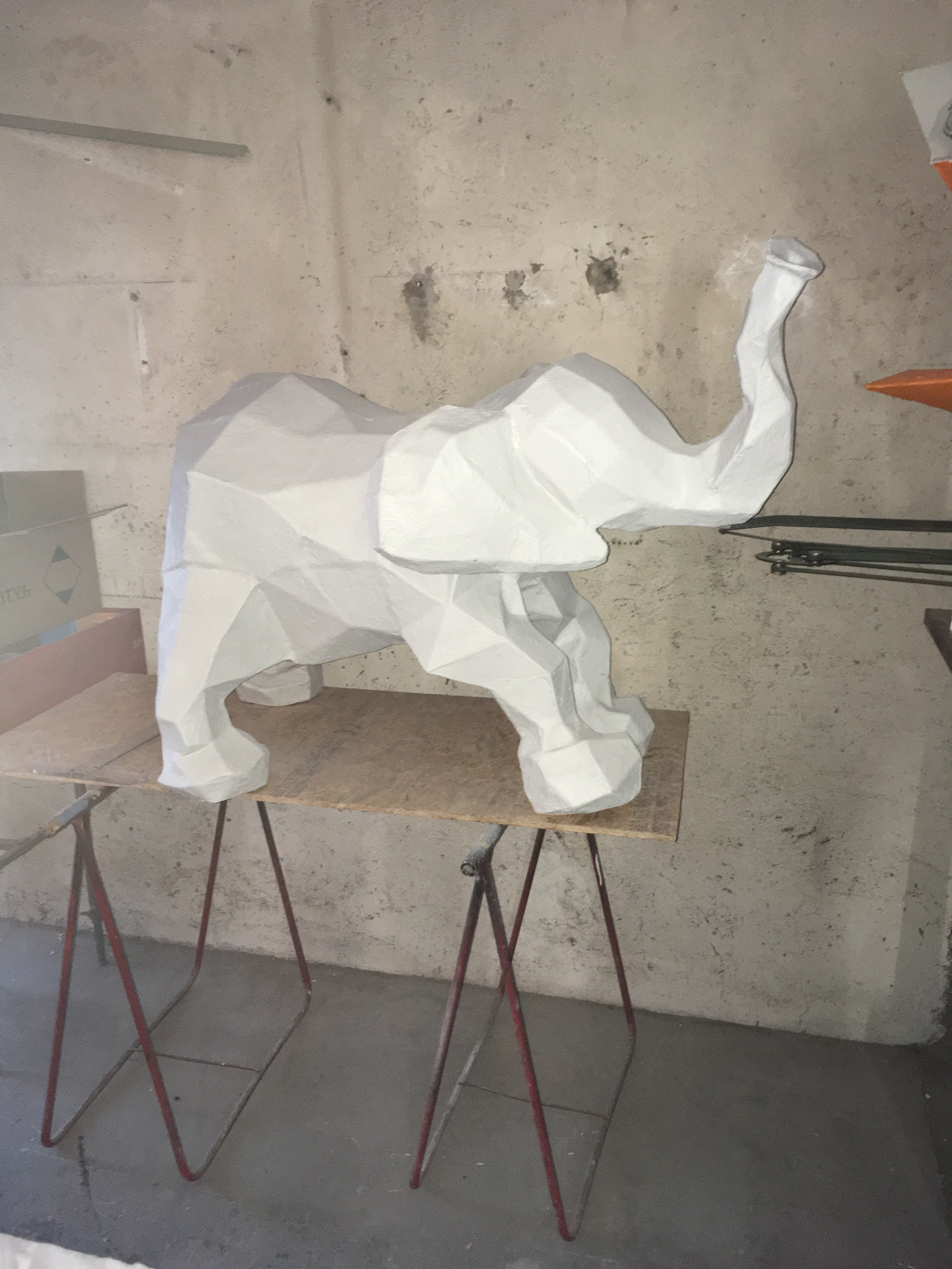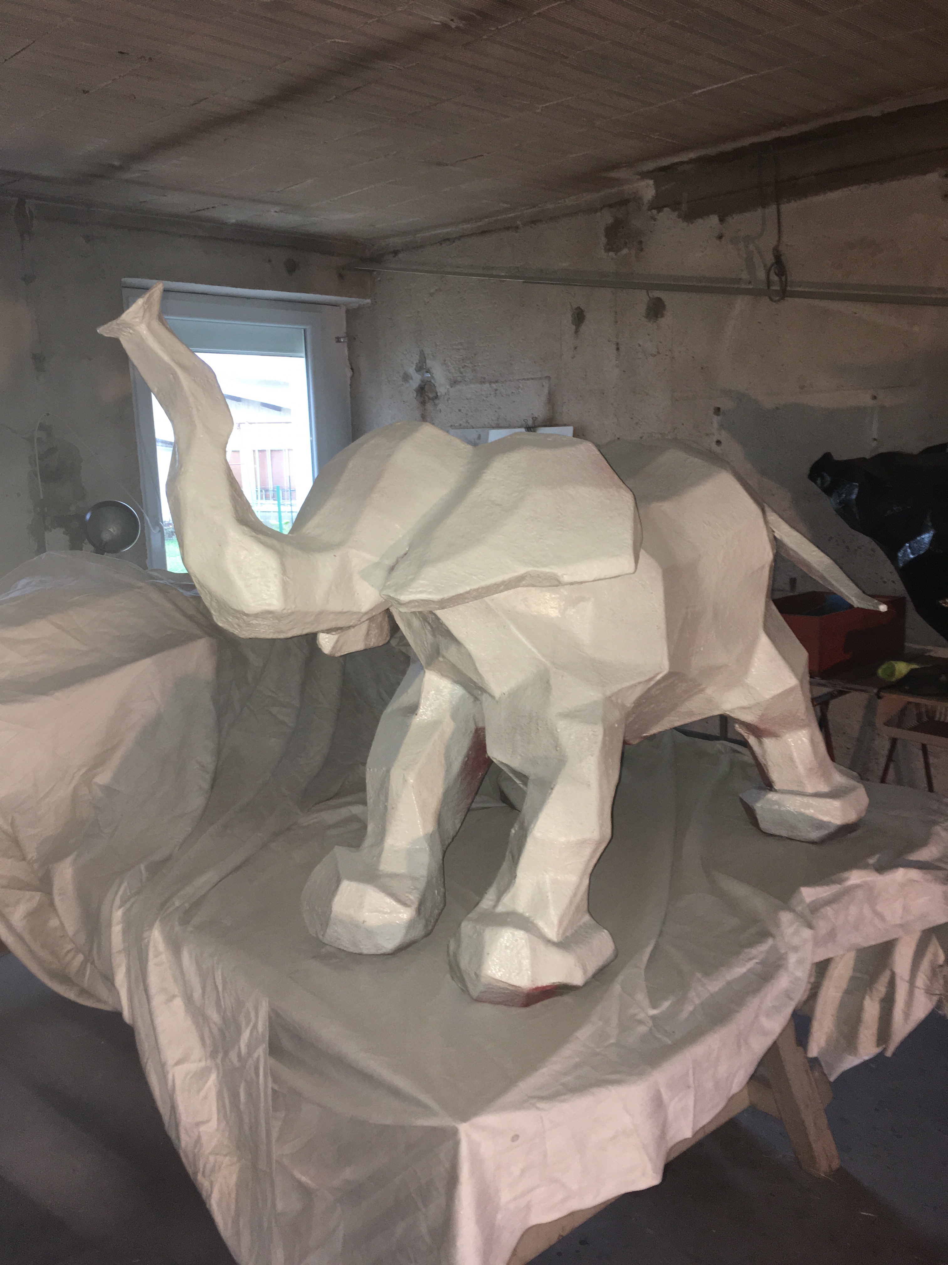 L’Eléphant ; 2015 ; Carton gris 2,5mm, fibre de verre, résine épicé et peinture ; 90x110x65 cm ; Anould ; France.