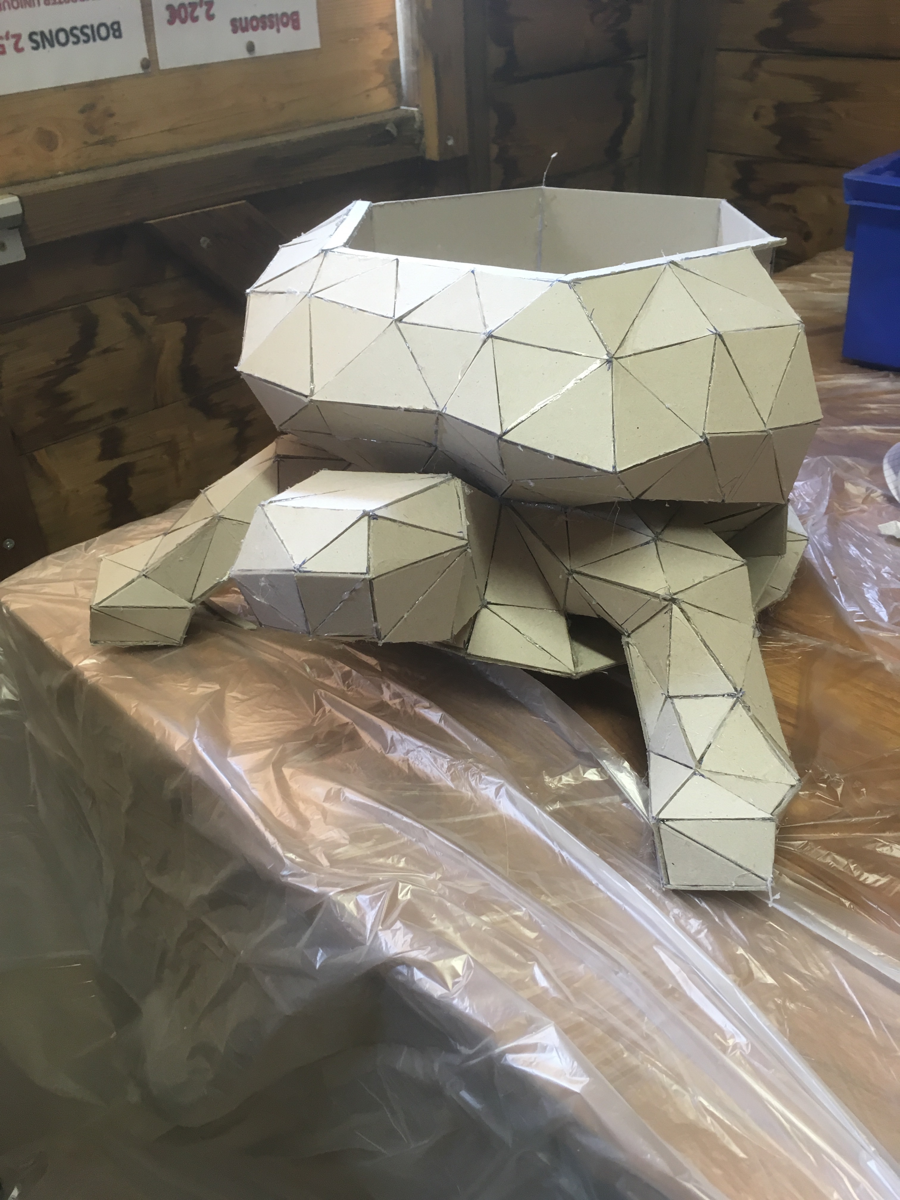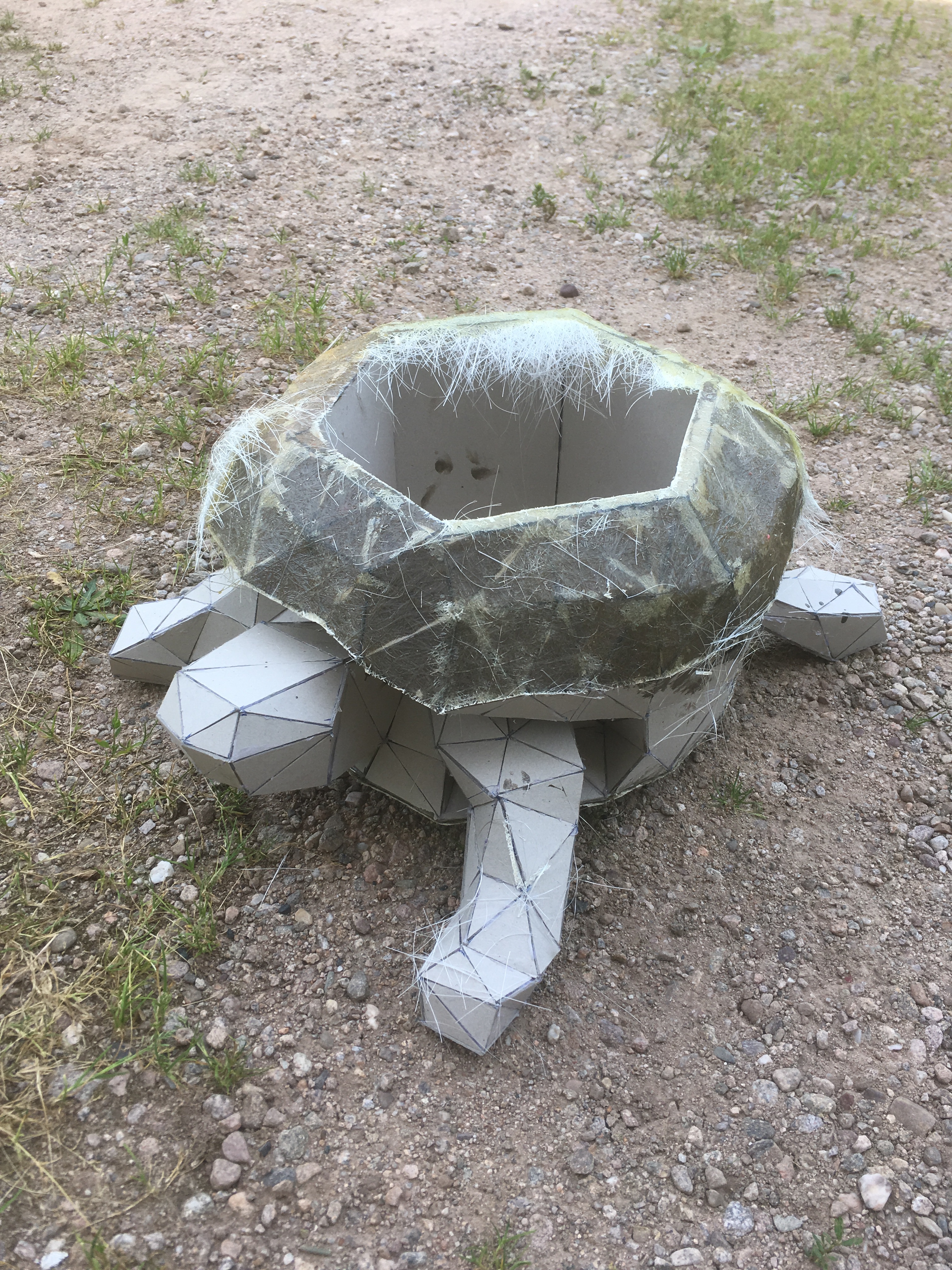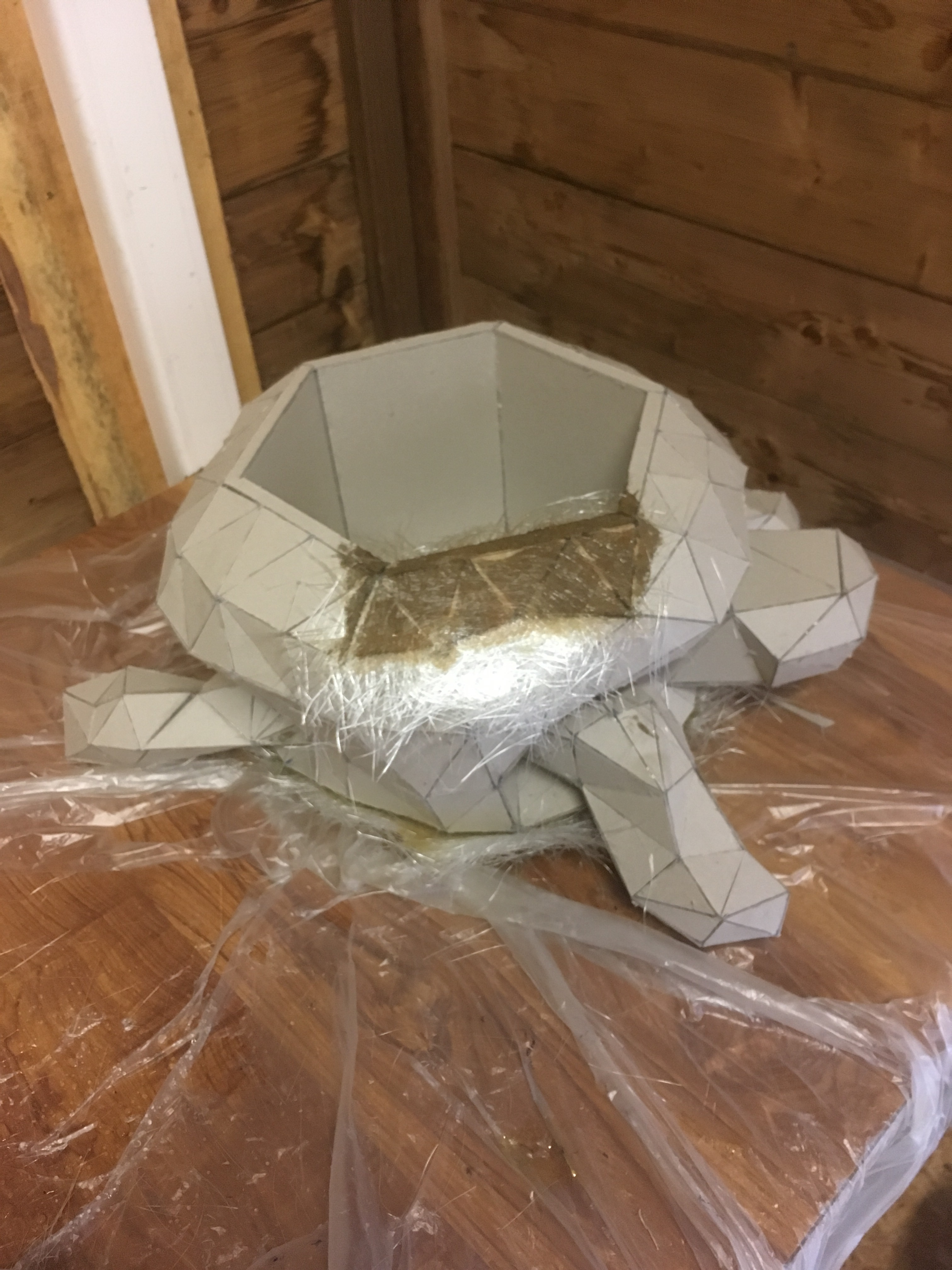 2ème étape : recouvrement de la base en carton par du mat de verre.
