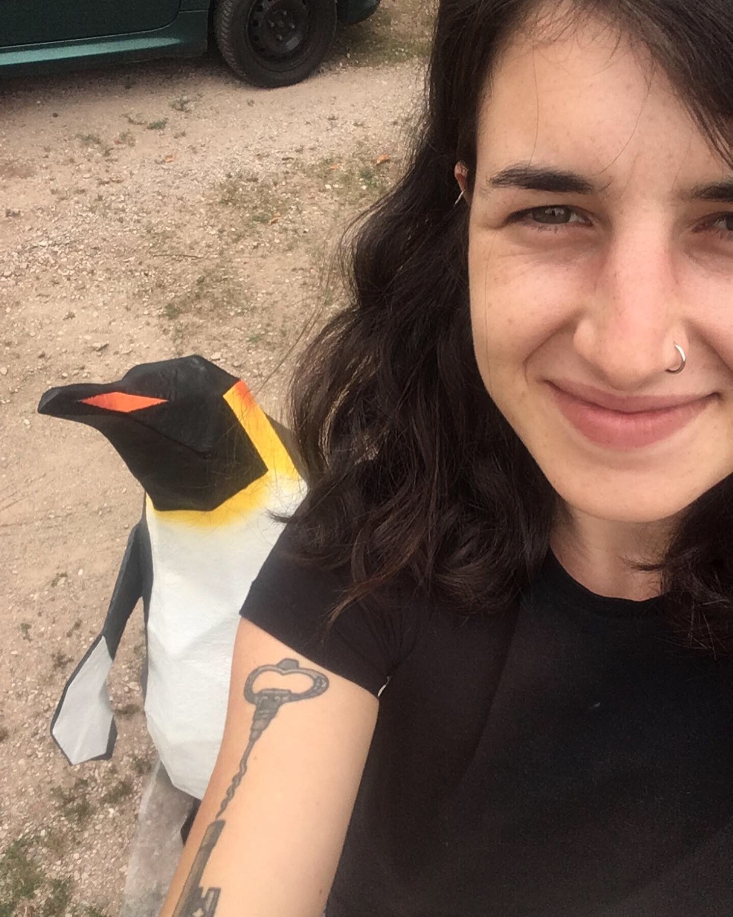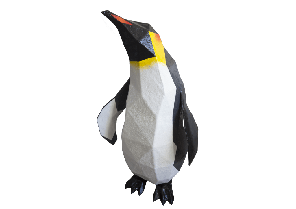 Le Manchot Empereur; 2018 ; Carton gris 2,5mm, résine polyester, mat de verre, peinture aérosole noir/ gris polaire/ gris/ blanche/ jaune/ orange/ rouge sanguin Montana, vernis brillant.
