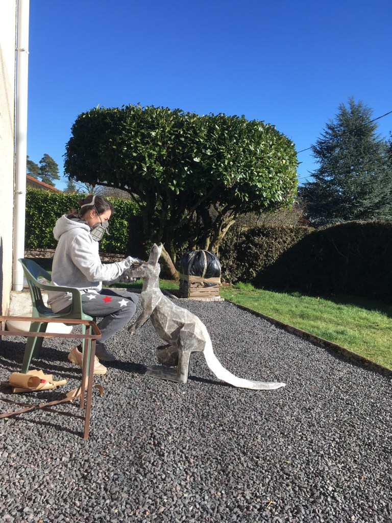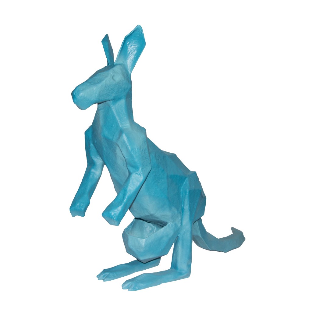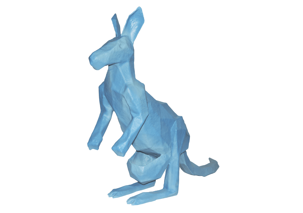 Le Kangourou ; 2020 ; Carton gris 2,5mm, résine polyester, mat de verre, peinture aérosole nuances de bleue Montana ; vernis aérosol mat ; Anould ; France.