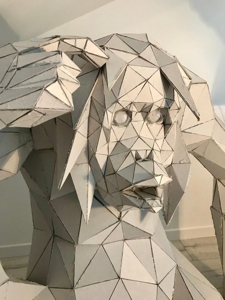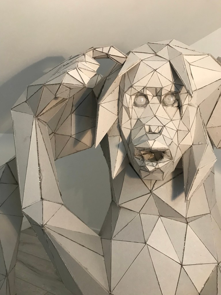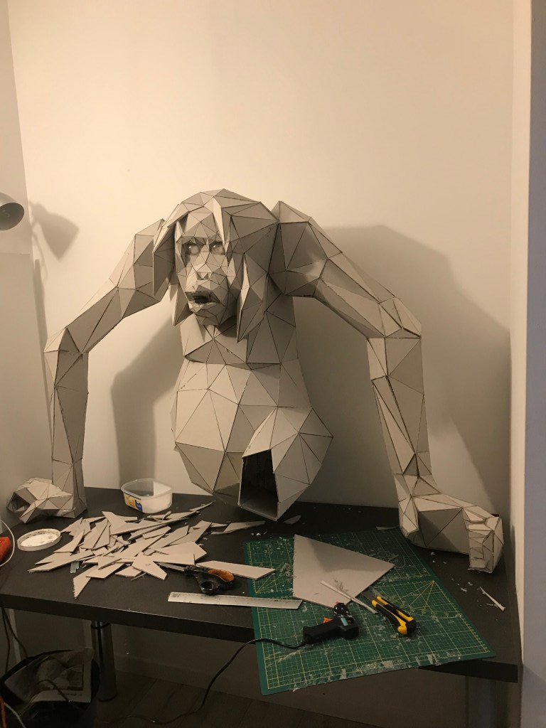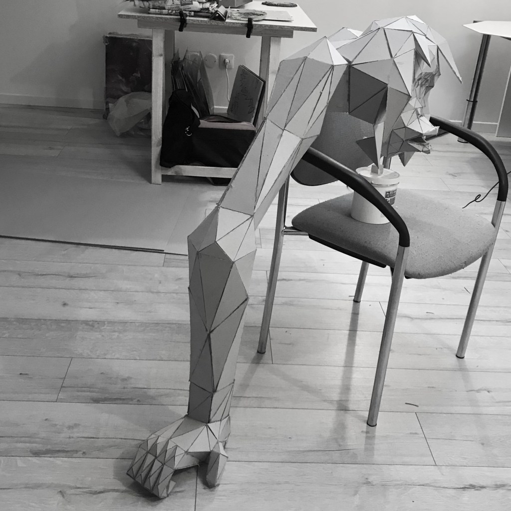 En attendant, ci dessous ,vous pourrez retrouver les différentes étapes au niveau de l’assemblage des formes géométriques en carton gris 3mm. Je travail sans outil informatique à l’avance, mon travail évolue sans contrainte mais plutôt par instinct.