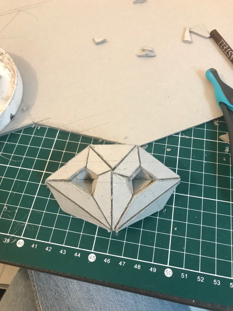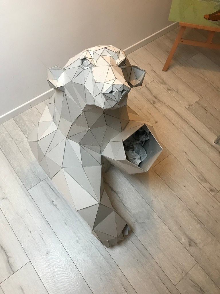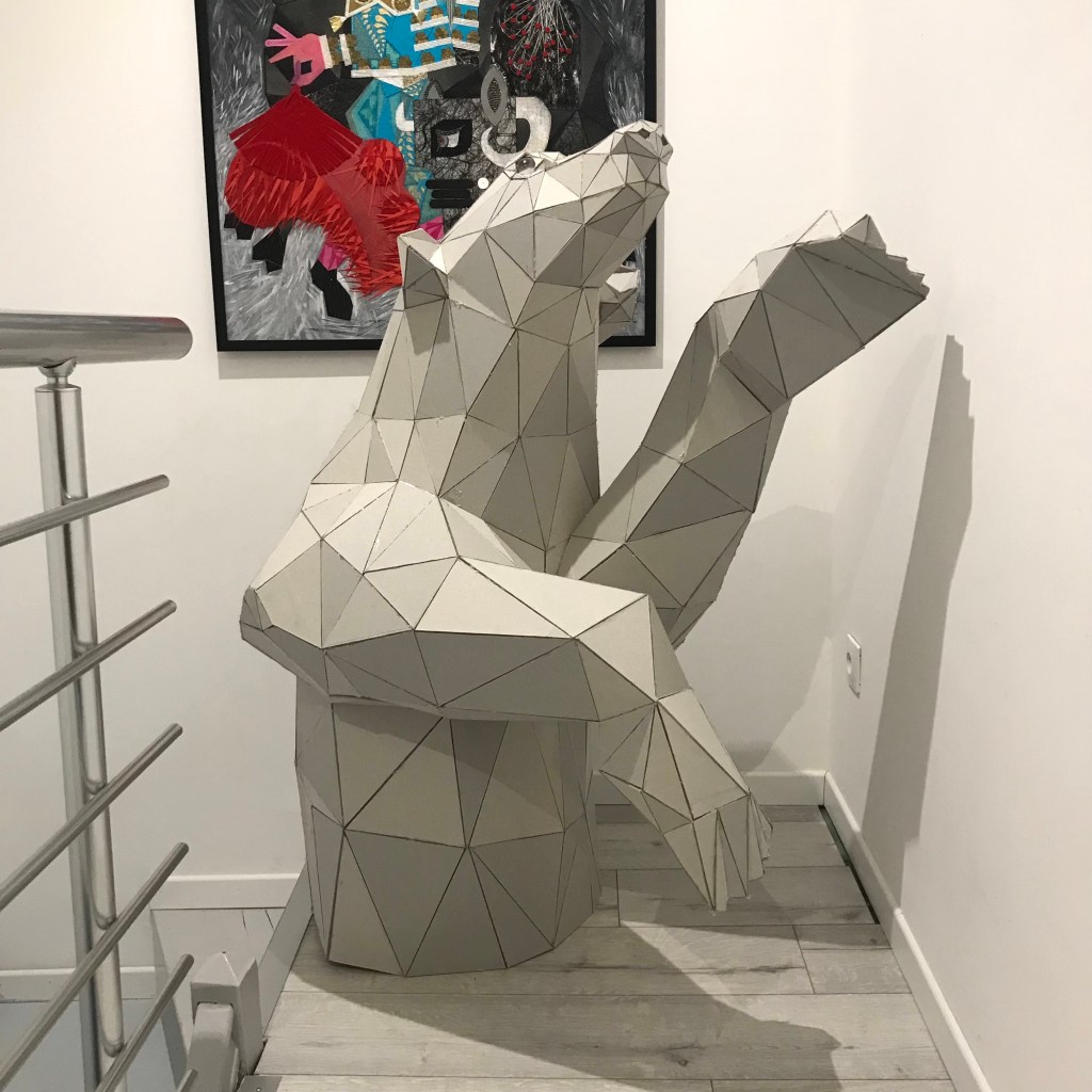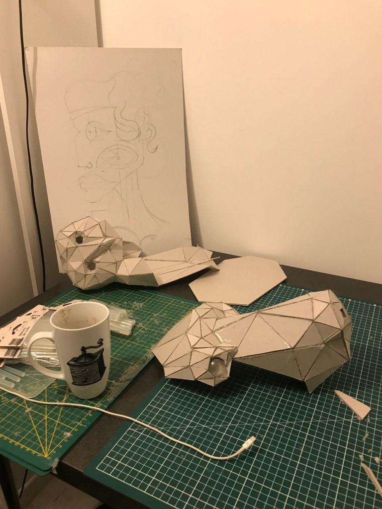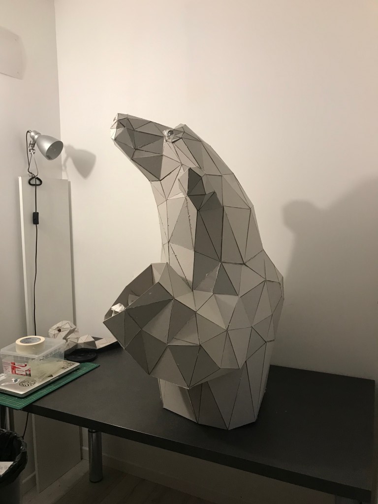 En attendant, ci dessous ,vous pourrez retrouver les différentes étapes au niveau de l’assemblage des formes géométriques en carton gris 3mm. Je travail sans outil informatique à l’avance, mon travail évolue sans contrainte mais plutôt par instinct.