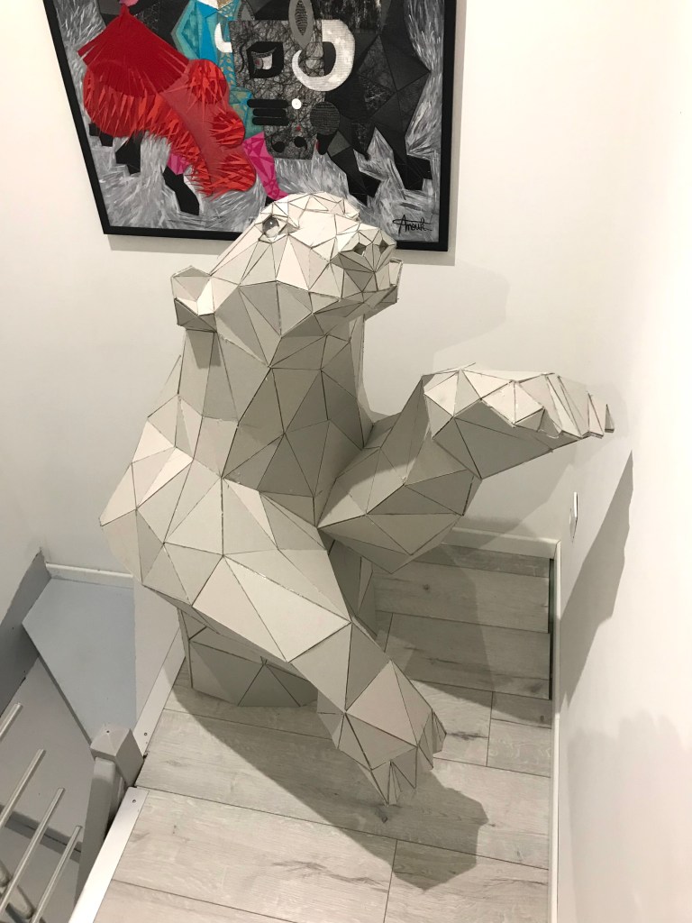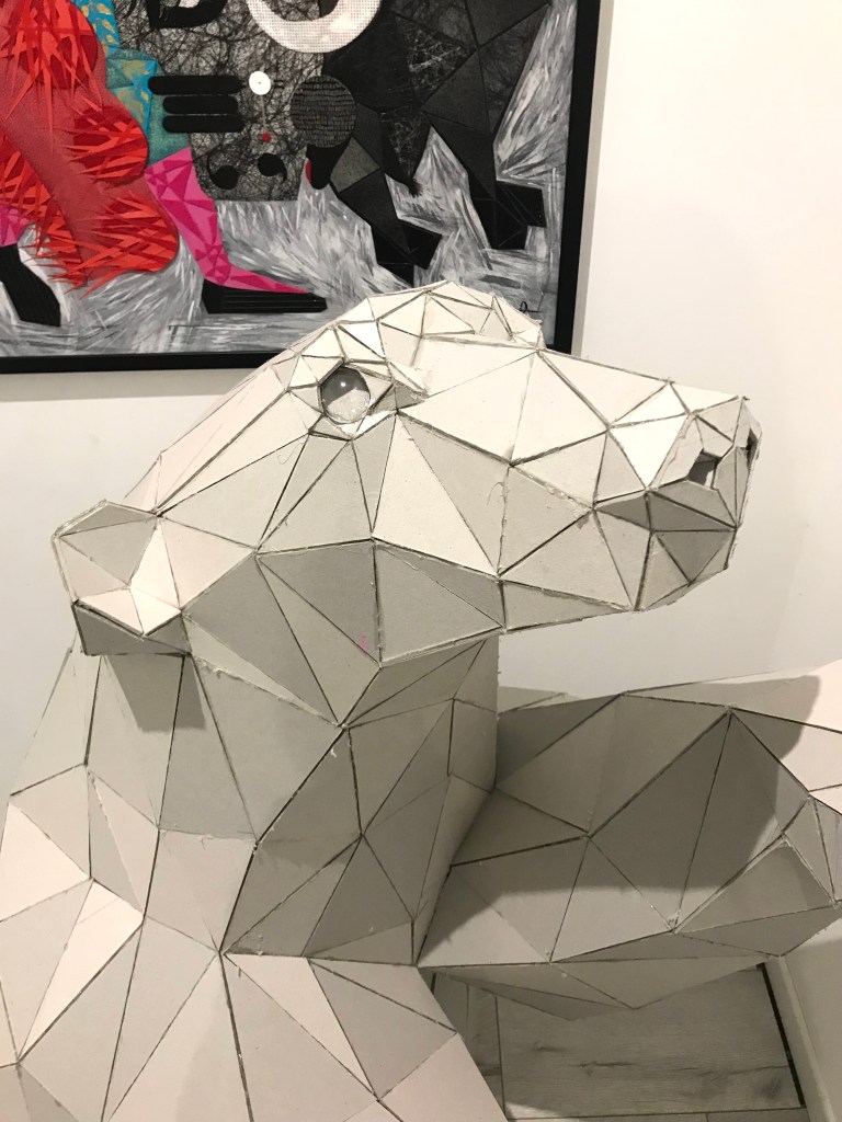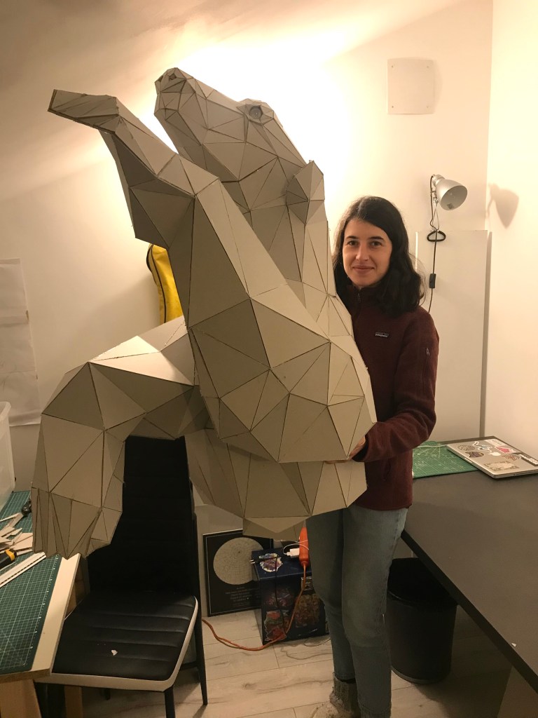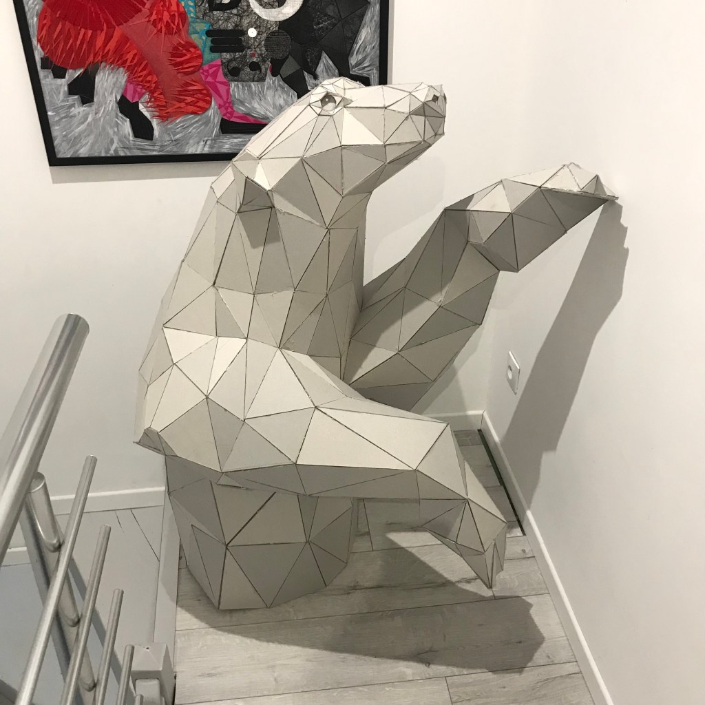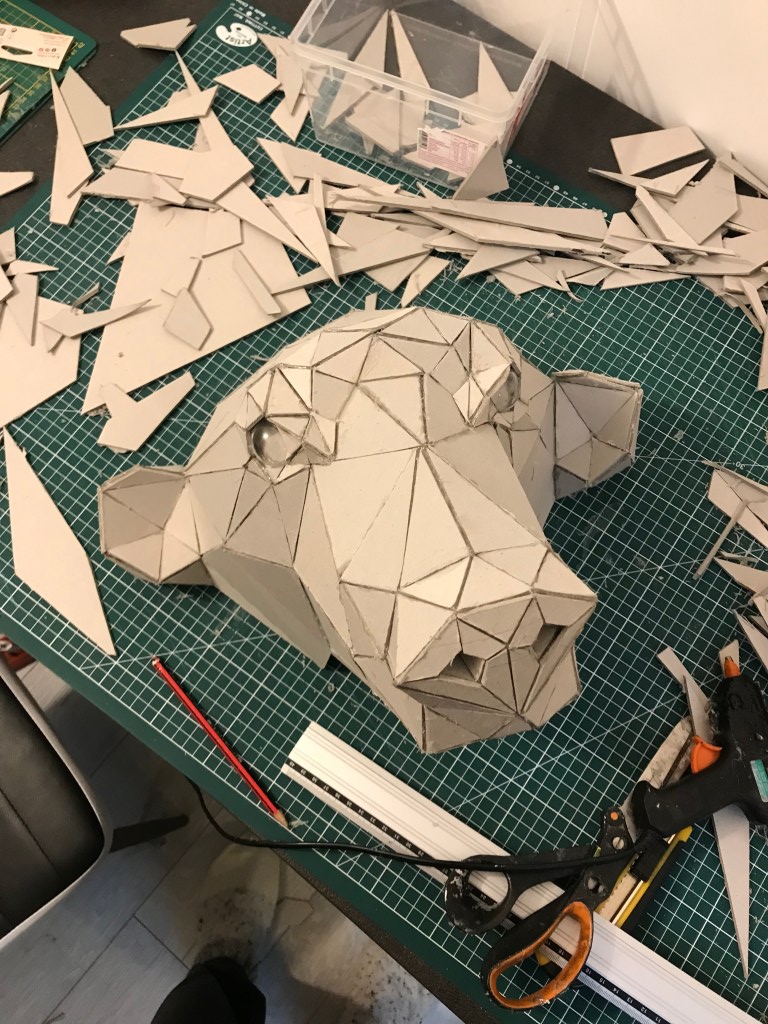 En attendant, ci dessous ,vous pourrez retrouver les différentes étapes au niveau de l’assemblage des formes géométriques en carton gris 3mm. Je travail sans outil informatique à l’avance, mon travail évolue sans contrainte mais plutôt par instinct.
